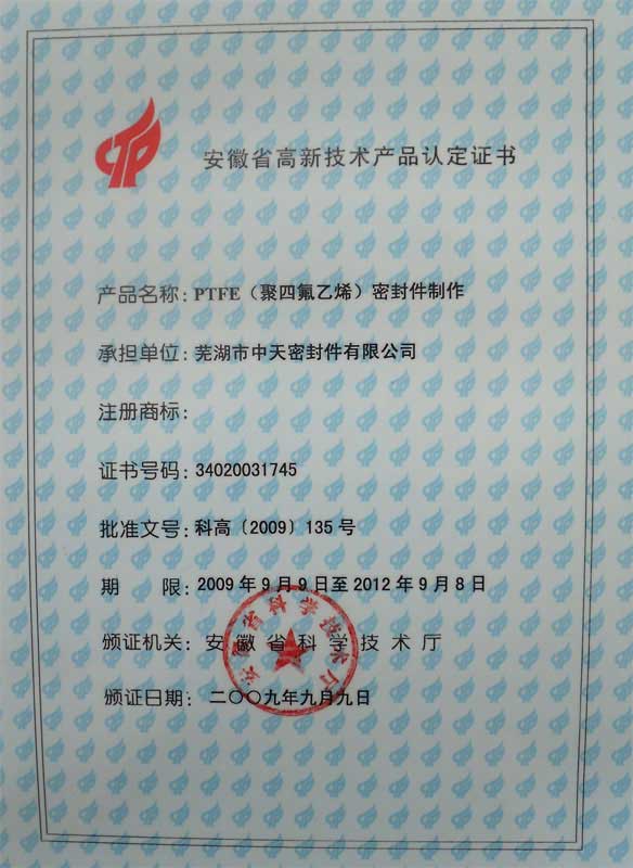 安徽省高新技術產品認定證書